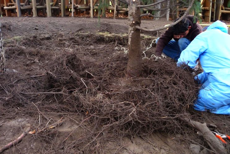 Removing the worst of the inward-growing and circling roots improves the tree's chances for survival.