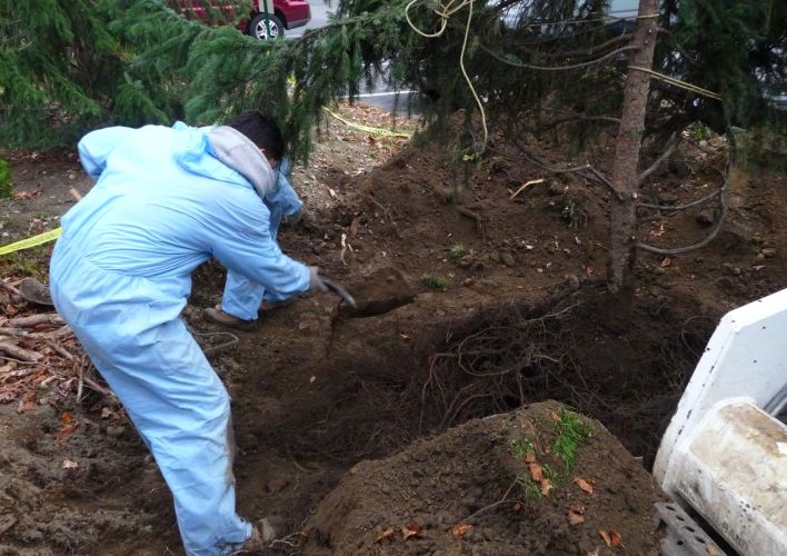 Rolando prunes thin fibrous roots from under the basket, to release the root ball from the ground. Most of the root mass has already been blown out.