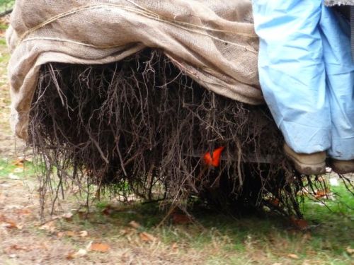 Root flare — where the trunk of a tree and its roots meet — is a critical  juncture in a tree’s anatomy.  Nowadays, trees coming onto the Massachusetts market often have root flares buried in the B&B root ball when they reach a job site for planting.  The contractor then has to remove the covering soil (removing burlap and wire basket in the process, which is a good thing) so that the tree and its root soil sit at the proper relationship to finish grade.  Once the tree is dug and watered in, the contractor adds 3-4″ of mulch, keeping it well away from that newly revealed root flare.  In this post from Taking Place, and this one, I show the crown effects of buried root flares on pear trees and on sugar maples.