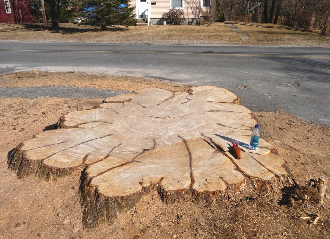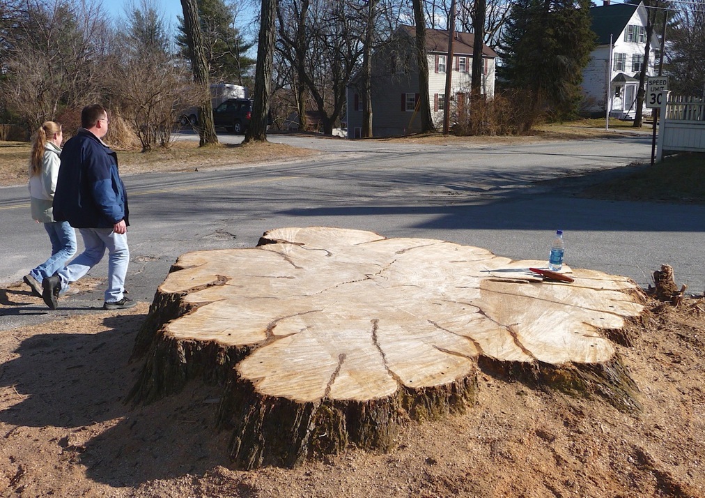 Yesterday I drove through Yarmouth, Maine, and stopped by the site where Herbie the New England Champion American Elm (Ulmus americana) had lived for over two hundred years before meeting his end this past January (see this post for the story).  I wanted to see Herbie’s stump and get a better idea of what 217 years of tree age looked like in plan view.