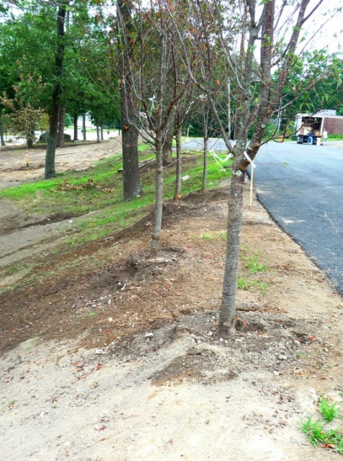 All of the trees are planted on sloping ground, but hardly look it -- another indication that root balls and water wells are too small. Got mulch, anyone? Particularly in this type of sandy soil, a watering schedule and at least a temporary irrigation system (set up to last and run through the first growing season) would help establish the trees. Planting like this has consigned what were once good trees to the chipper.