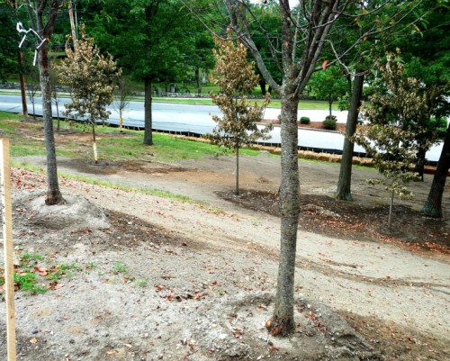 From the school drive above the slope, the view is as disappointing. The pears look like the toughest of the new trees out there. Fall color in July is never a good sign, but at least they still have leaves. The zelkovas are mostly bare.