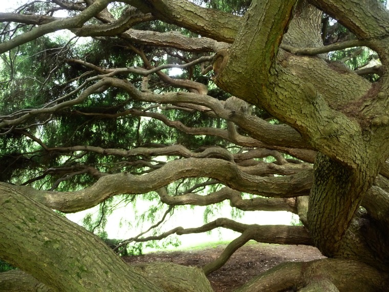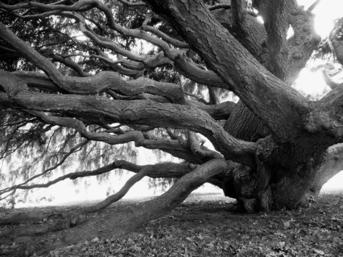 Take a look at these photos.  We visited on a cloudy-bright day, the type of day typically good for photographing, but found so much contrast between shadow under the crown and light outside the crown that I resorted to black and white for some photos, the better to show the tree’s form.